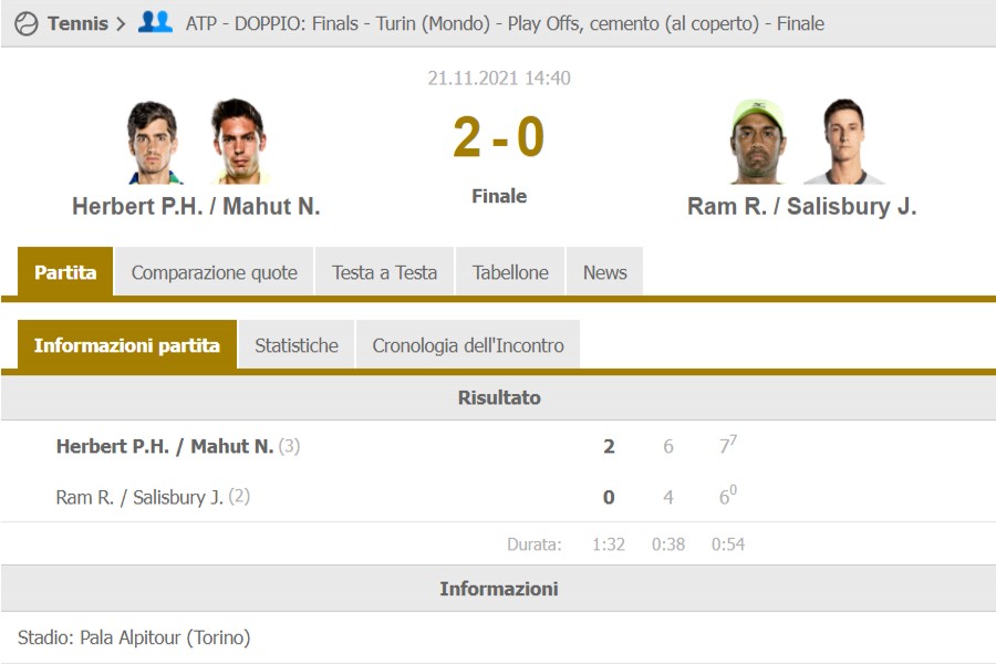 (ANSA) - TORINO, 21 NOV - Pierre-Hugues Herbert e Nicolas Mahut sono i campioni nel doppio delle Atp Finals: la coppia francese trionfa nella finalissima per 2-0.