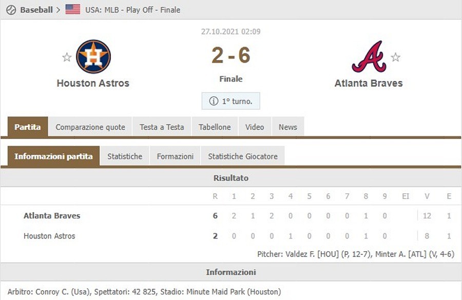 Gli Atlanta Braves vincono la prima gara della World Series. Nella notte a Houston in Texas è andata in scena la prima partita della finale del campionato di baseball americano e la squadra