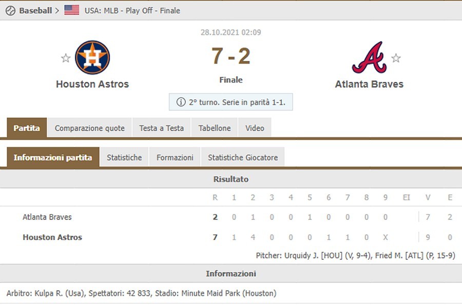 difesa e procura due punti, si capisce che sarà una serata difficile per i Braves. Gli Astros hanno avuto una solida partita del loro lanciatore Josè Urquidy e fa sempre una bella differenza.
