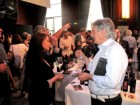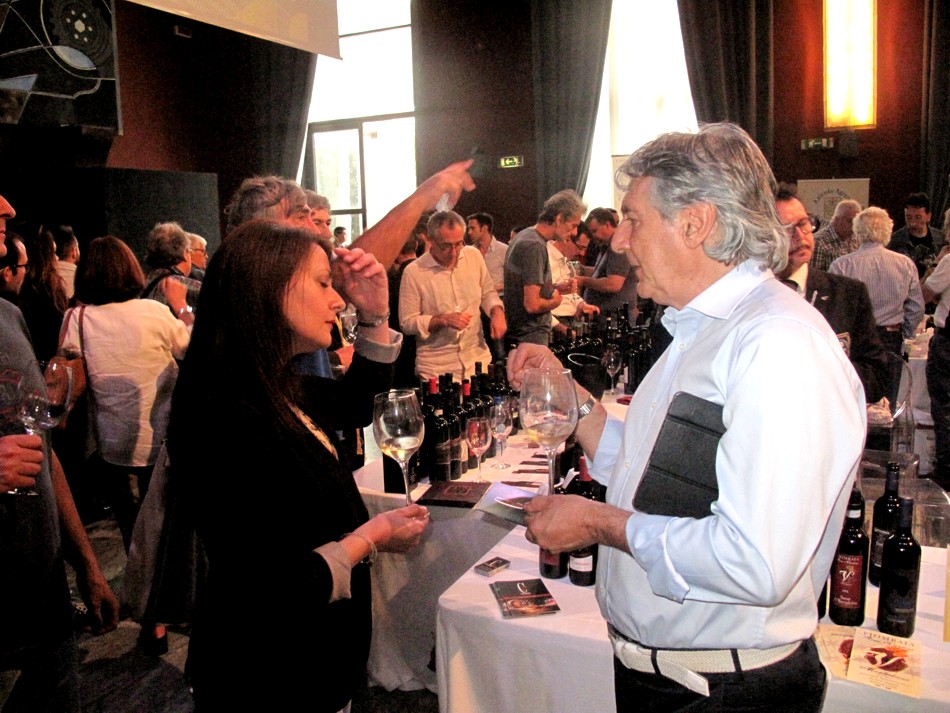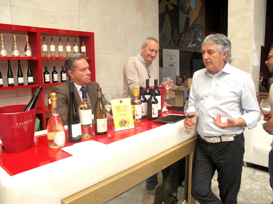 Luciano Pandolfini degusta una coppa di Falesco e scambia alcune opinioni col titolare dello stand, Enrico Ranaldi.