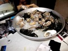 La delicata operazione del taglio del carapace della mazzancolla, degustata, subito dopo l'ostrica, con una coppa di Prosecco.