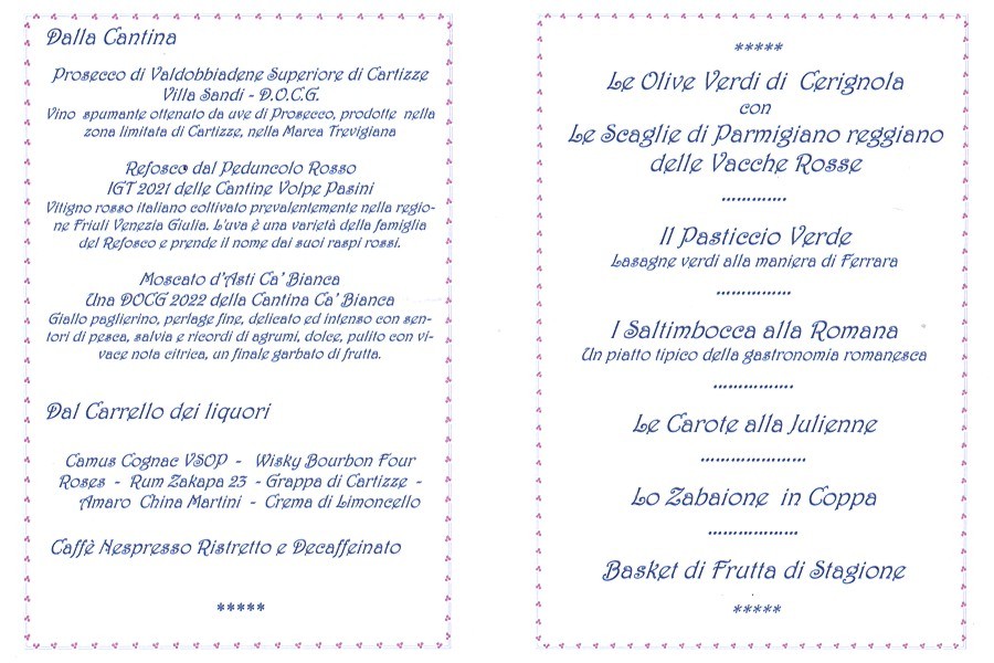 fare. La foto del menù fa vedere cosa abbiamo mangiato e bevuto e devo dire che ci siamo fatti un sacco di risate anche se, all'inizio, un piccolo velo di tristezza ci ha pervasi nel