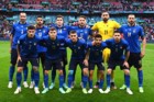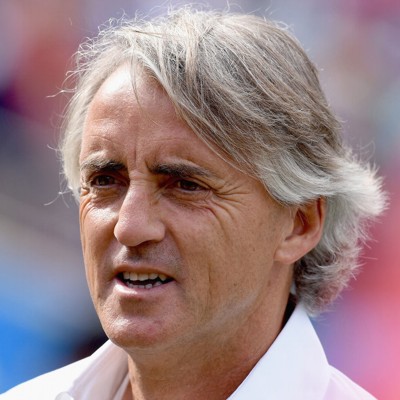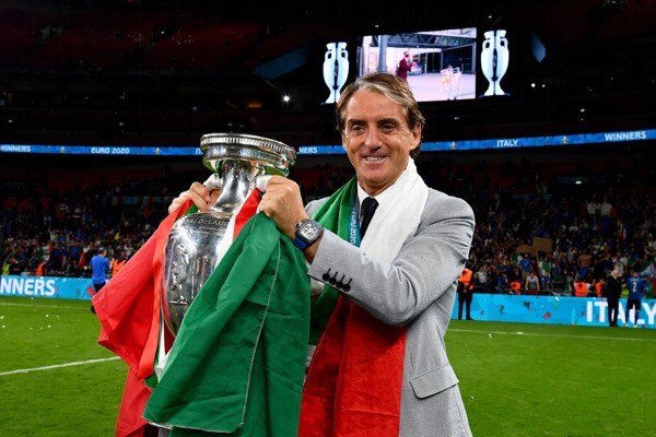 Roberto Mancini innalza la Coppa, simbolo della vittoria, avvolta dal drappo tricolore