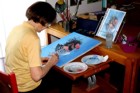 FB cioè Fausta Braccesi mentre sta dipingento il Matto delle Conchiglie Divinatorie che entrerà a far parte della mia collezione