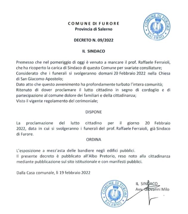 L'ordinanza comunale con la quale si sancisce il lutto cittadino in onore del'ex sindaco di Furore.
