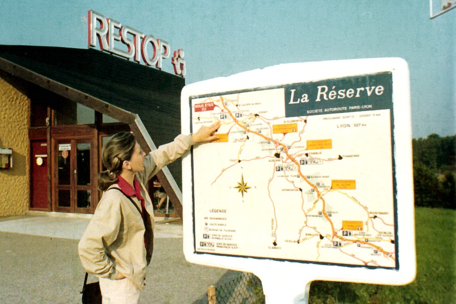 24 luglio. Torniamo a casa. Fausta consulta un tabellone con le strade che portano verso il sud della Francia.