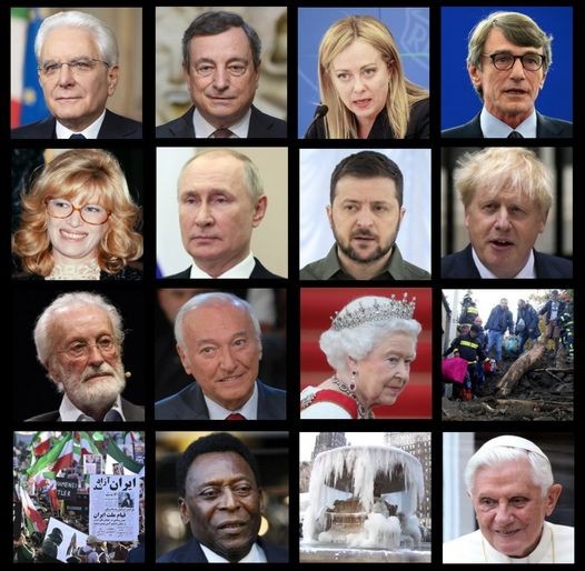 Nella foto, partendo dal Presidente Mattarella fino all'ultima foto, quella di Benedetto XVI, sono visibili i più importanti personaggi dell'anno, sia deceduti che ancora viventi,