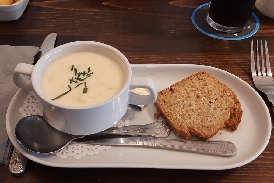 colpito: si chiama Seafood Chowder ed è una gustosissima e vellutata zuppa di pesce, servita calda e con crostini di accompagnamento.