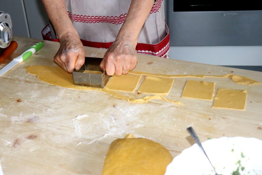 .. Preparate l'impasto con farina e uova e tirate una sfoglia molto sottile: tagliate quadrati di circa 12 cm di lato e mettete su ognuno un mucchietto di ripieno