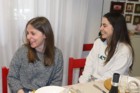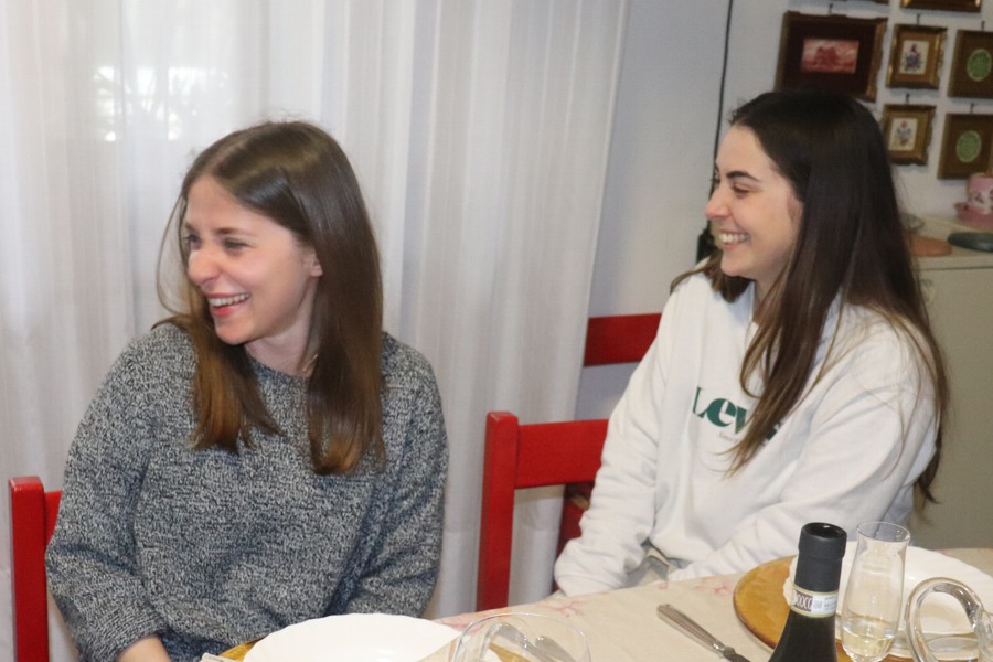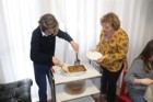 Stefania e Carlotta ridono divertite perché Fausta malgrado le due palette ha qualche difficoltà a tagliare la prima fetta di Pasticcio Verde.