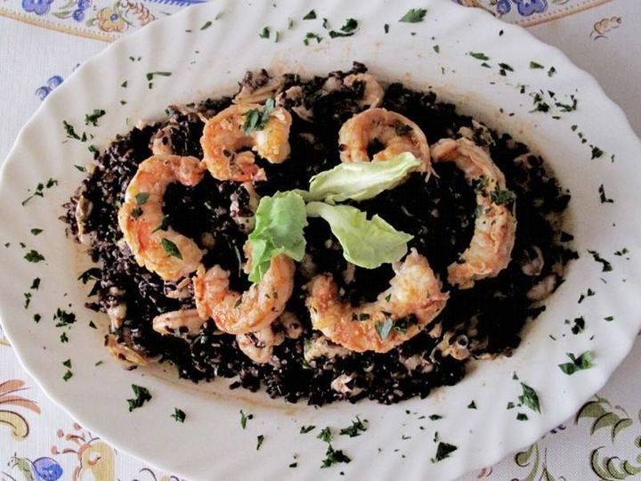 Risotto Nero con i Gamberi (v. foto) che utilizza un riso particolare, il riso Venere, una specialità del Piemonte.