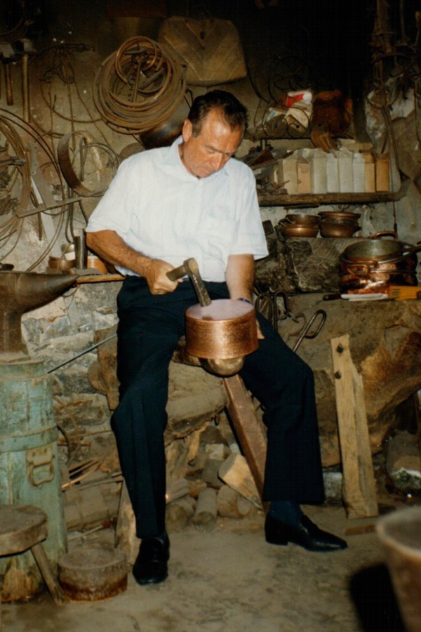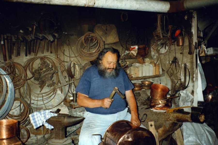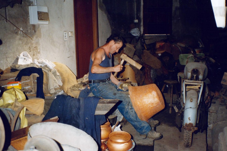 Foto 5/10 - Sempre nella bottega dei rami; un'altro artigiano è intento a "tocchettare" un bellissimo paiolo.