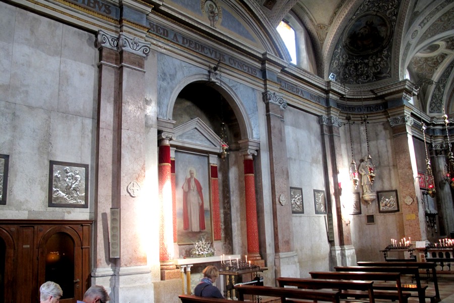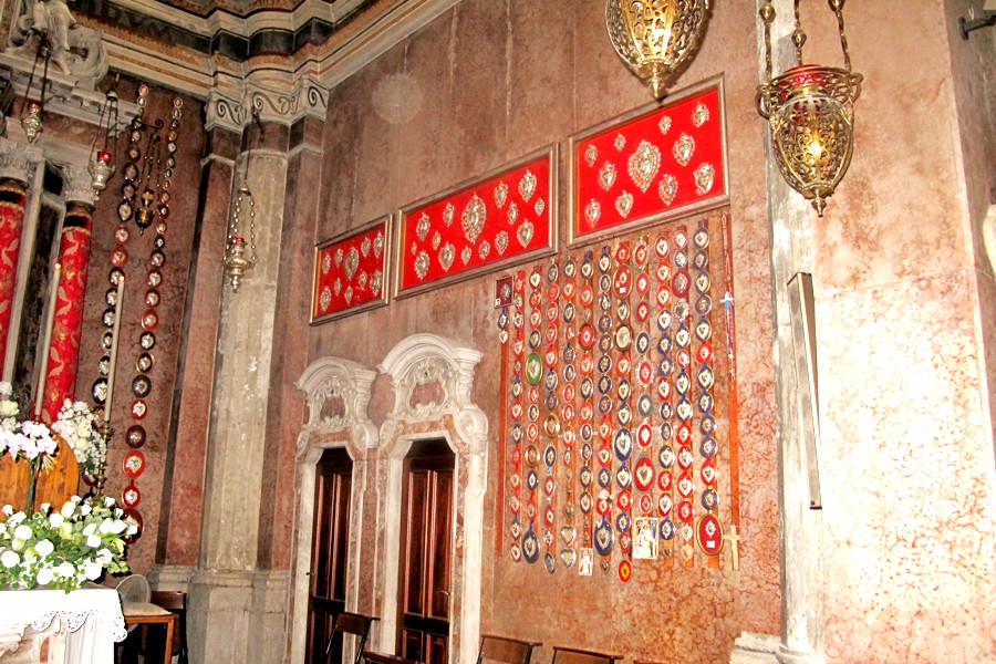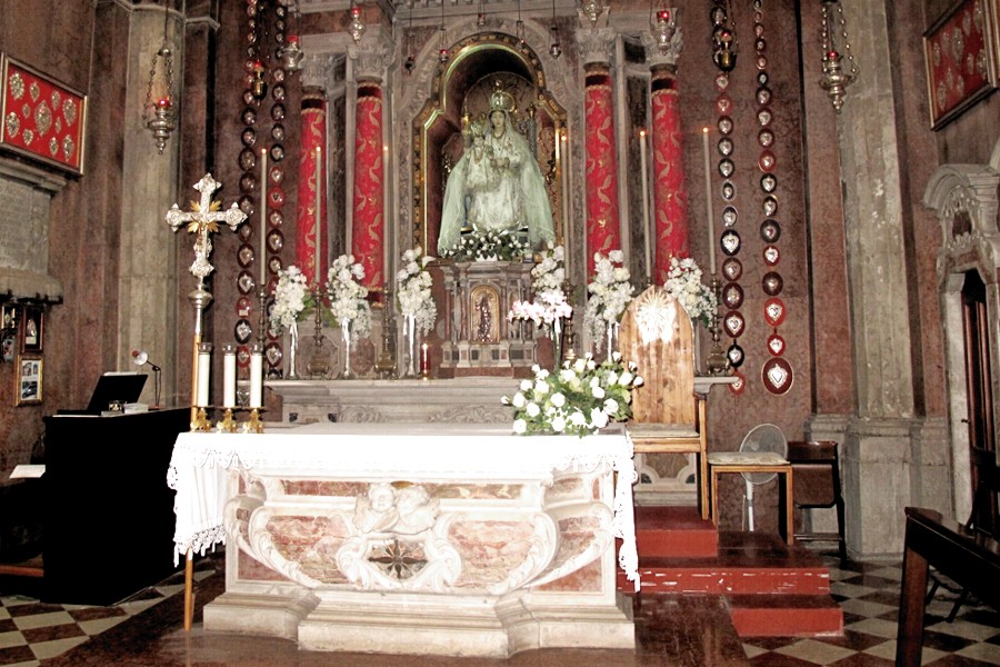 in silenzio guardava con benevolenza nella loro direziono (un racconto che nel secolo scorso è stato anche affrescato sul soffitto del santuario, dopo il voto alla Madonna del 1944).