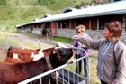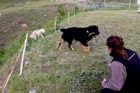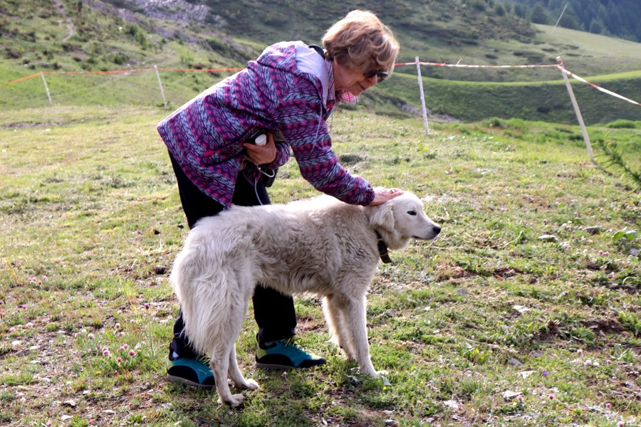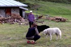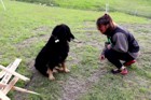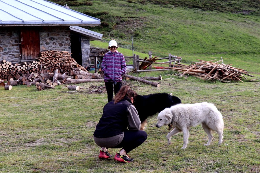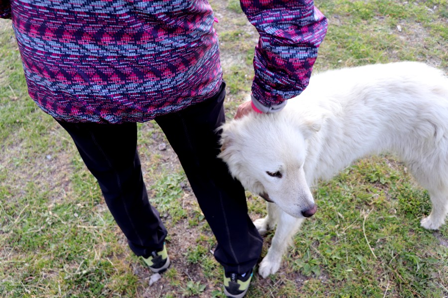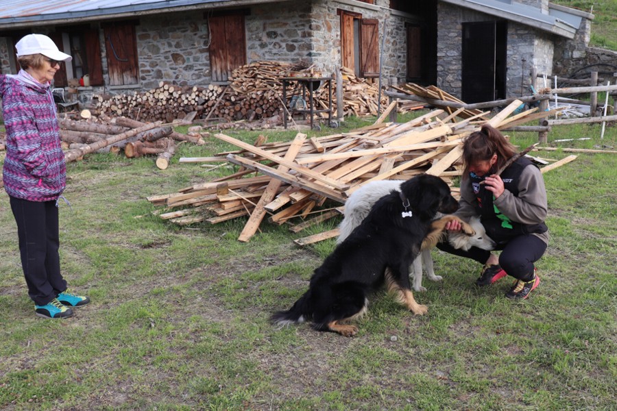 Lasciamo la stalla e andiamo a prendere una boccata d'aria. Fausta familiarizza con Bella, uno dei tre cani di Titti.