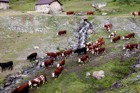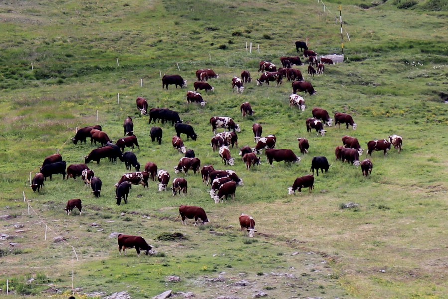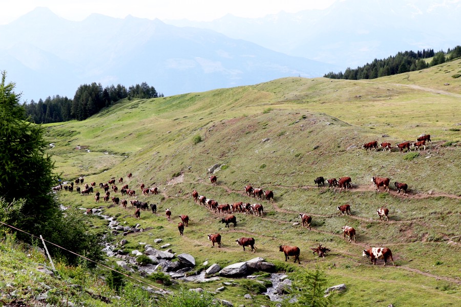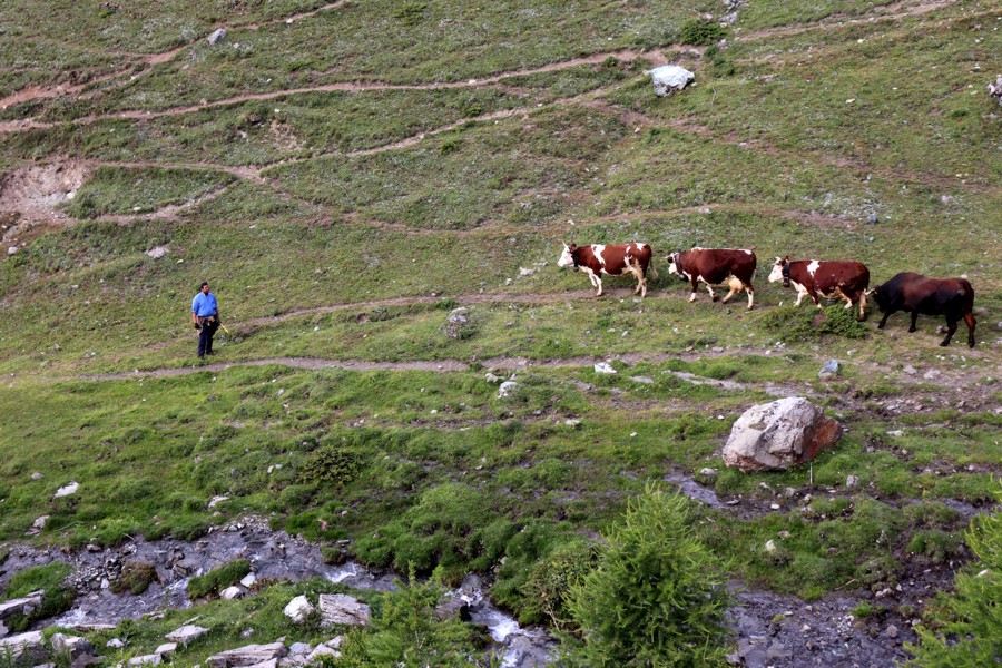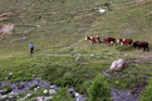 Le vacche hanno abbordato la discesa che le porterà fino al pascolo mentre il mandriano le aspetta per guidarle.