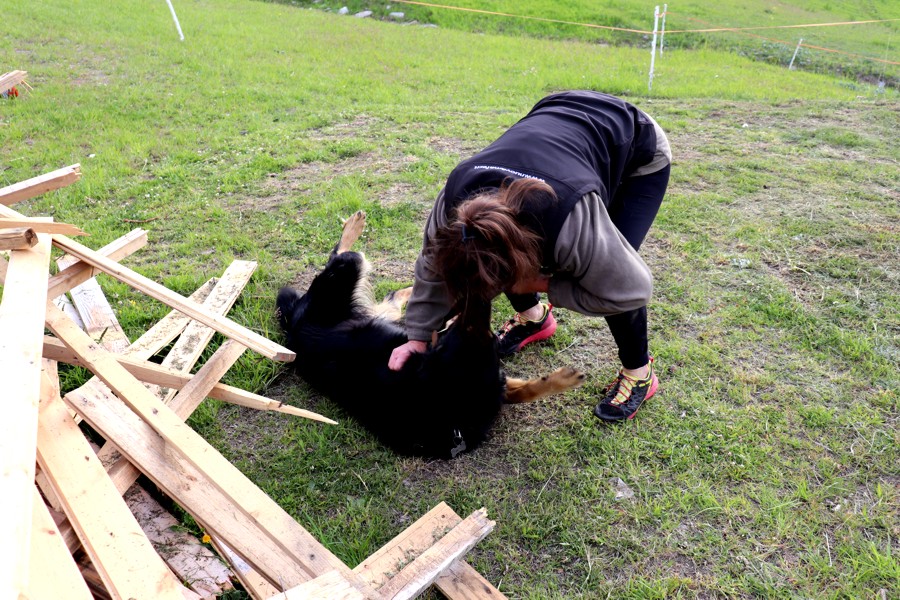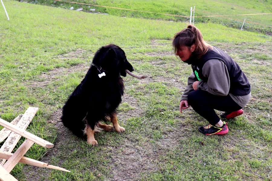 Balù, con in bocca il bastone che Titti ha lanciato, torna dopo averlo trovato in mezzo ai cespugli, seguito da Bella che ha contribuito alla ricerca.
