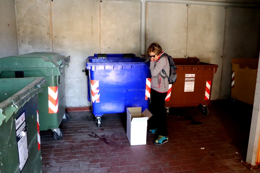 Non potevo terminare questa rappresentazione fotografica di Pila senza evidenziare un particolare interessante. A poca distanza dal nostro condominio c'era un luogo, chiuso con una grossa porta di legno che custodiva, al suo interno tutta una serie di cassonetti destinati ad accogliere i rifiuti urbani della zona. Un luogo organizzato per davvero molto bene con una grande cura nella pulizia del deposito. Infatti ogni giorno un mezzo della nettezza urbana era presente per la raccolta differenziata. Non abbiamo mai visto un cassonetto che traboccasse di immondizia.