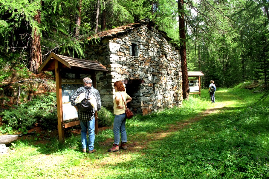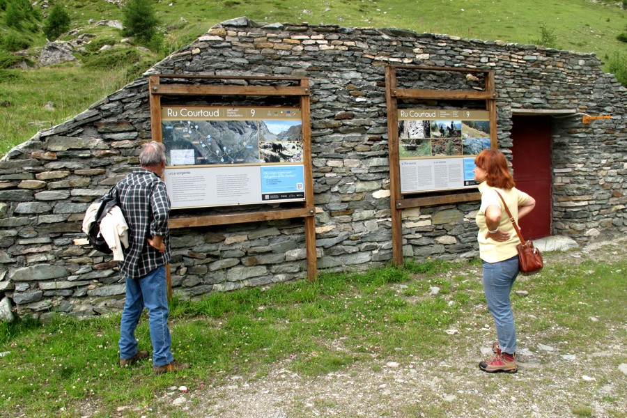 Foto 12/35 - Anche più avanti ci sono altre paline che raccontano la nascita e la storia del Ru Courtod. Qui, tra le due paline, una baita destinata ai controllori del