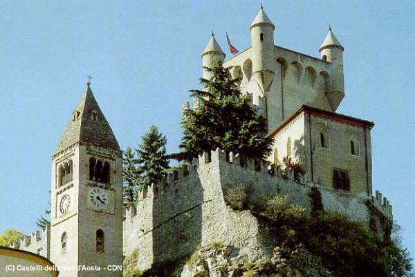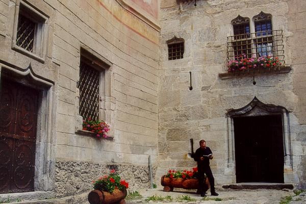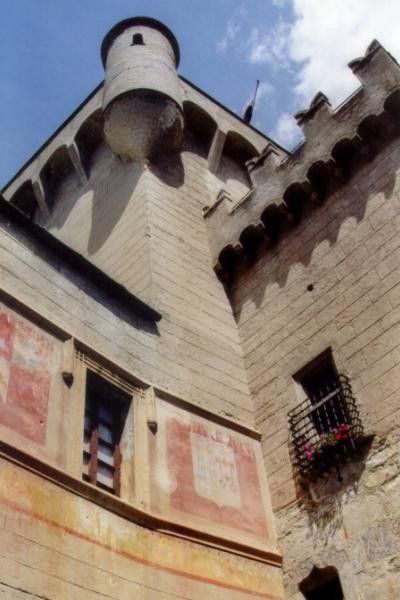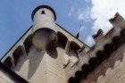 Da sinistra a destra: - Davanti all'ingresso principale del castello. - Una delle quattro torrette angolari. - Uno degli ingressi laterali del castello. |
