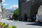 La Porta Pretoria. Sullo sfondo la catena del Monte Bianco.
