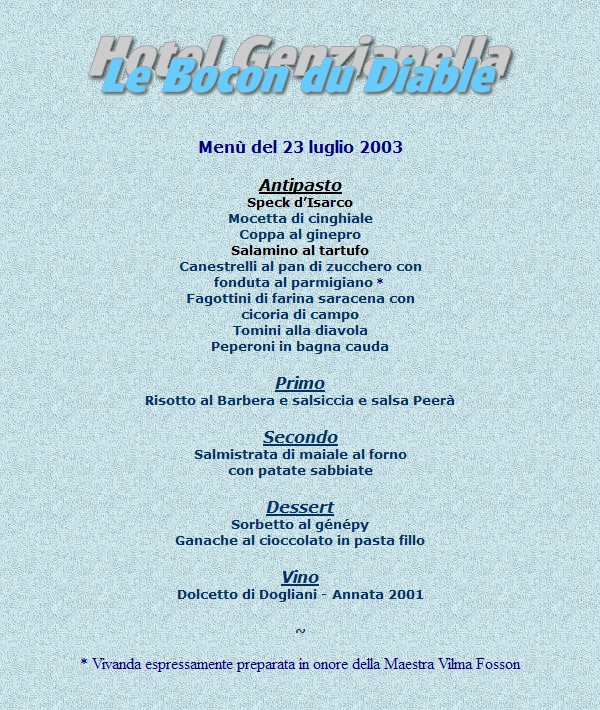 In questa fotografia sono rappresentate due delle tre figure femminili che costituiscono l'asse portante dell'Hotel Genzianella di Saint Jacques dove abbiamo avuto il piacere di trascorrere una stupenda serata all'insegna della cucina tradizionale (e non solo) della Valle d'Aosta ad un livello a dir poco strabiliante. A questo proposito si consulti il Menù della serata.