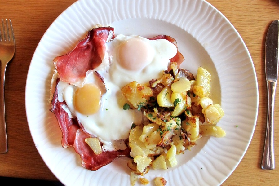 Un piatto classico nelle baite della Val Gardena: Uova, Patate e Speck.