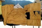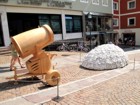 Un cannone sparaneve in legno, davanti al quale giace un mucchio di banane in gesso. Il tema di questa