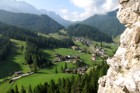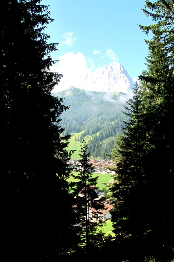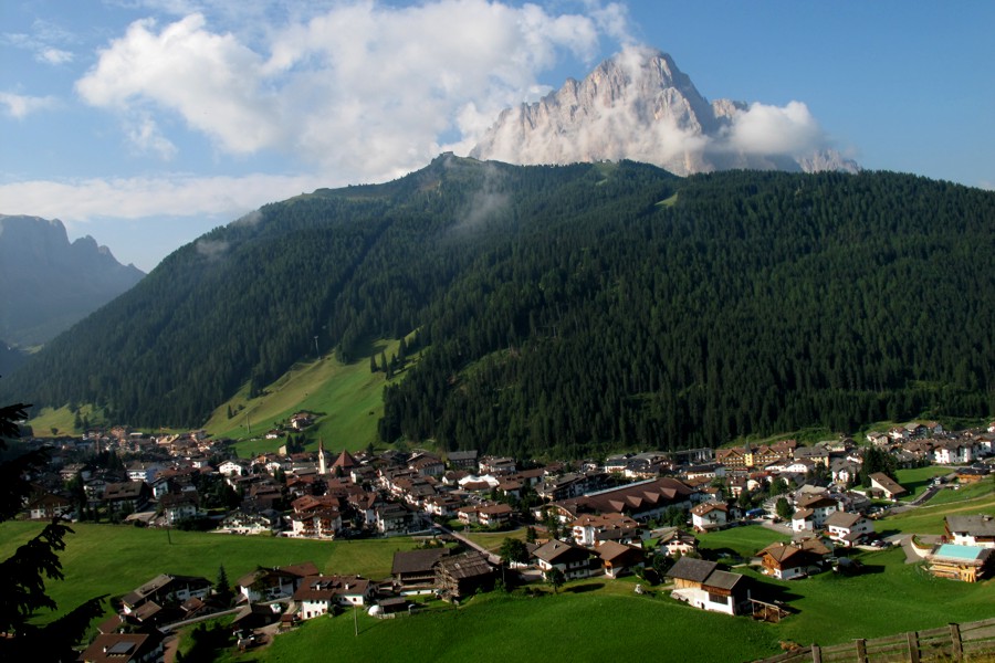 Una panoramica dell'abitato di Selva dal sentiero della Via Crucis. Sullo sfondo il Sassolungo.