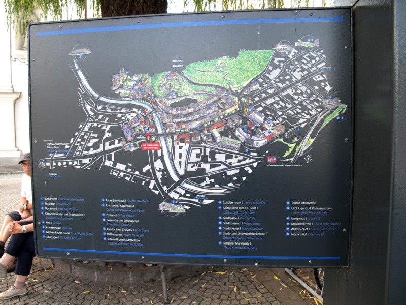 Foto 11/35 - Brunico. Il grande tabellone stradale, all'inizio di Via Dante, con la mappa della città. Il puntino rosso indica il punto esatto docve eravamo noi.