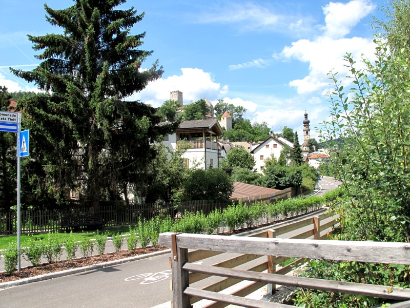 Foto 20/35 - Brunico. La Tielt Promenade. Al centro visibili i merli del Castello. La cupola che si intravede sullo sfondo, a destra, è quella della Chiesa di Santa Caterina am Rain.