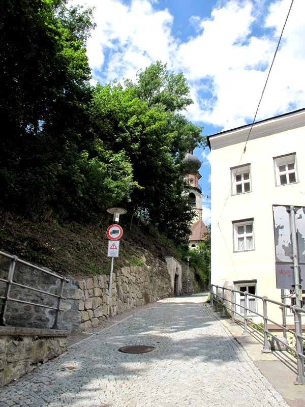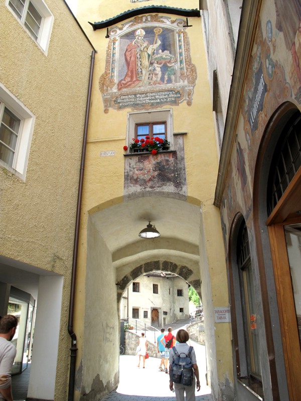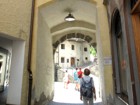 Foto 24/35 - Brunico. Il vicolo che porta al Castello. Sullo sfondo si intravede il campanile della Chiesa di Santa Caterina.