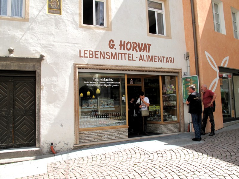 Foto 26/35 - Brunico. Sempre in Via Centrale il famoso negozio di Alimentari Horvat, molto rinomato a Brunico per la qualità dei prodotti che difficilmente sono reperibili da altre parti. Horvat è l'unico, della zona, ad offrire un grande assortimento di spezie, tisane di frutta, tisane di erbe, marmellate e confetture, frutta secca e ingredienti per dolci in 120 cassetti vetrati e a vendere in sacchetti di carta.