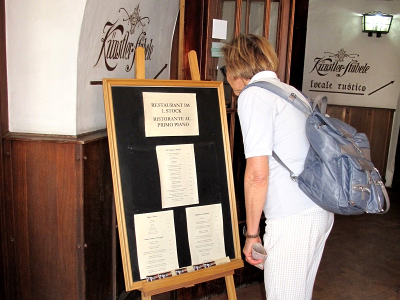 Foto 30/35 - Brunico. All'ingresso del ristorante Fausta consulta il menù. La cronaca di questo pranzo è visibile nella pagina «Al ristorante».