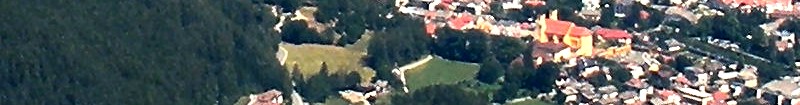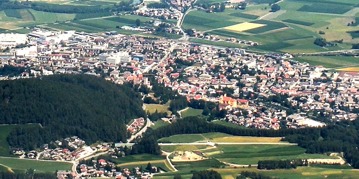 Panoramica della città di Brunico dall'alto. Ben visibile, in basso, il Duomo.