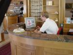 denominativa dell'albergo, una veduta dell'esterno, il banco