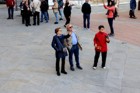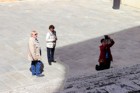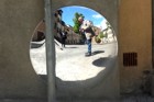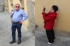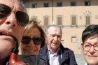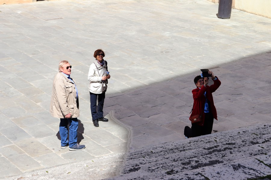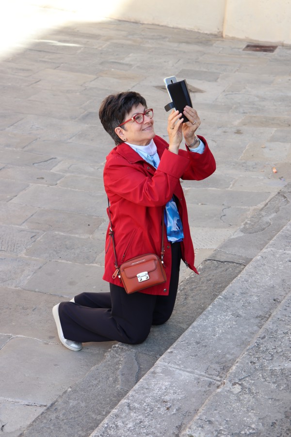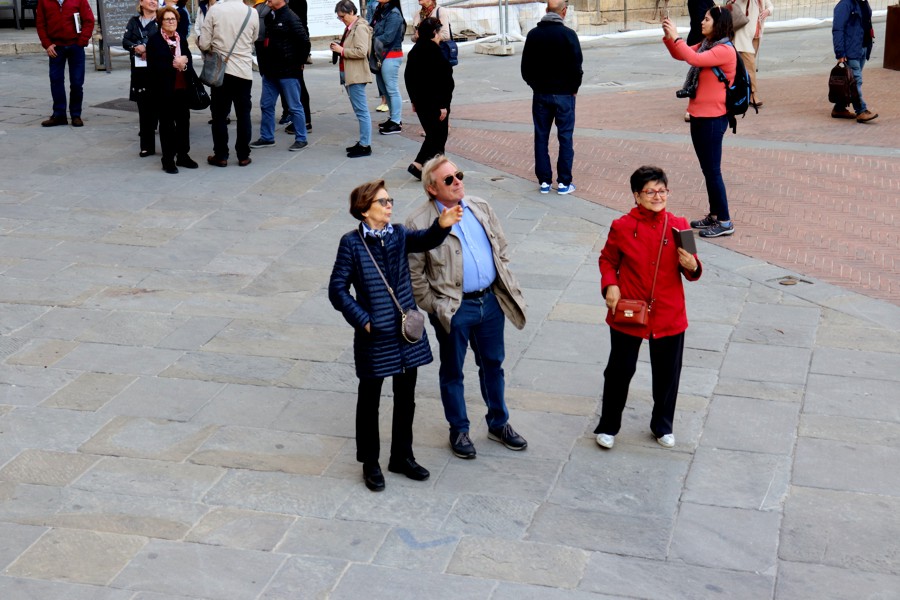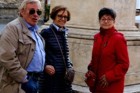 Aldo, Fausta e Tiziana guardano verso alto chiedendosi cosa sarà mai quella specie di cavallo mozzato che si trova sul sagrato della Basilica.