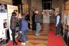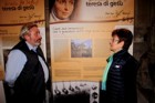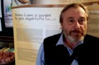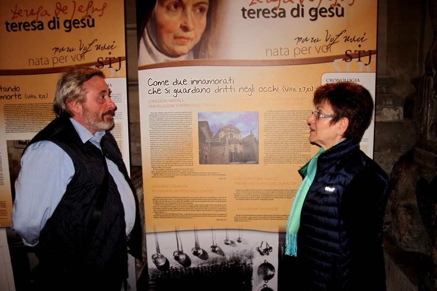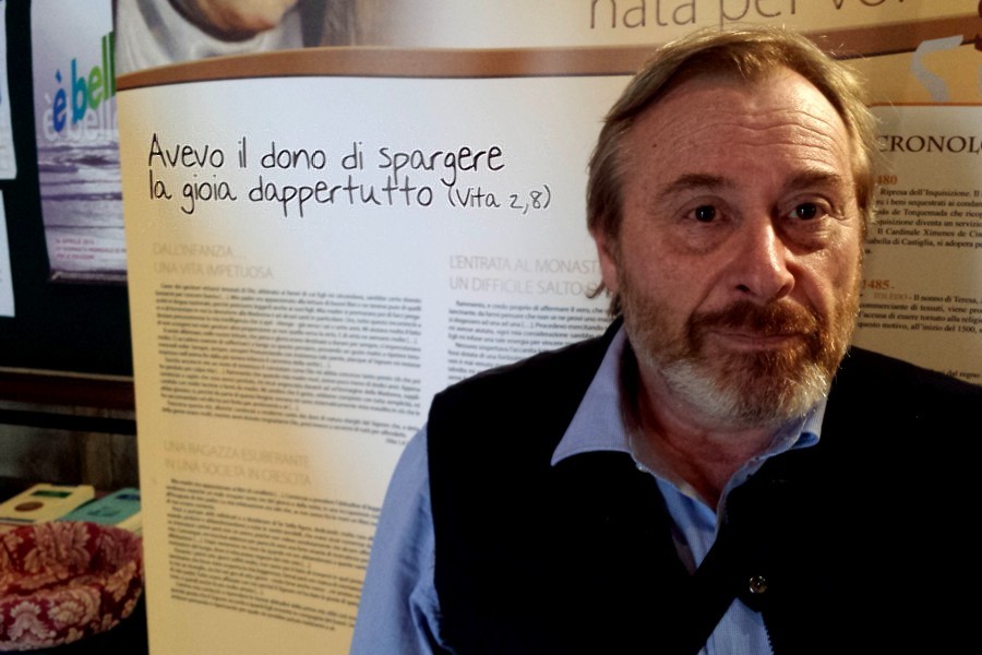 Andrea mentre sta immortalando Aldo davanti ad un cartellone a sfondo religioso.