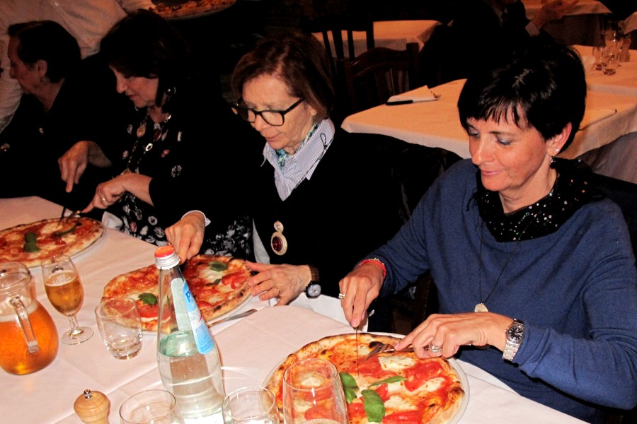 Le pizze sono arrivate e Ivana, Fausta e Mariangela sono intente a sferrare il primo... colpo.