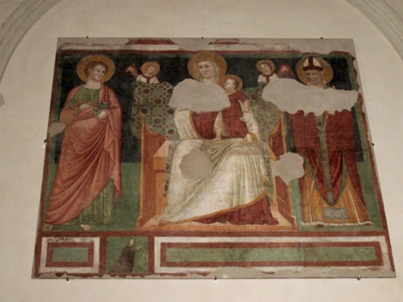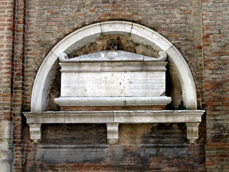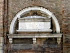 Foto 7/50 - Chiesa di S. Agostino. Sulla facciata della chiesa un sarcofago inserito in una lunetta. Dovrebbe essere quello di S. Giovanni Evangelista al quale, originariamente, era titolata questa chiesa.
