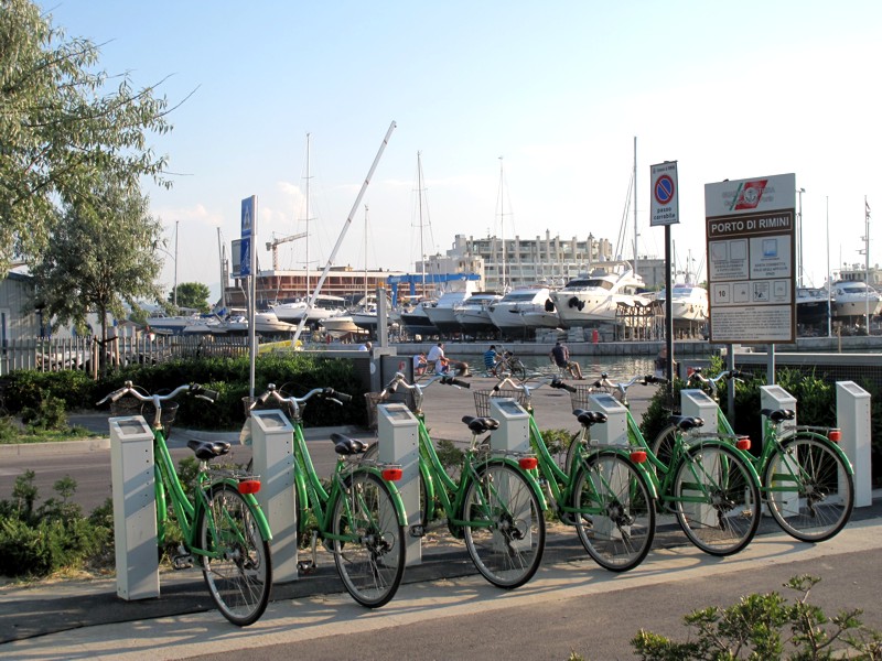 Foto 32/50 - Nel porto di Rimini le bici a noleggio testimoniano la grande passione dei riminesi per la bicicletta. Sullo sfondo la darsena.