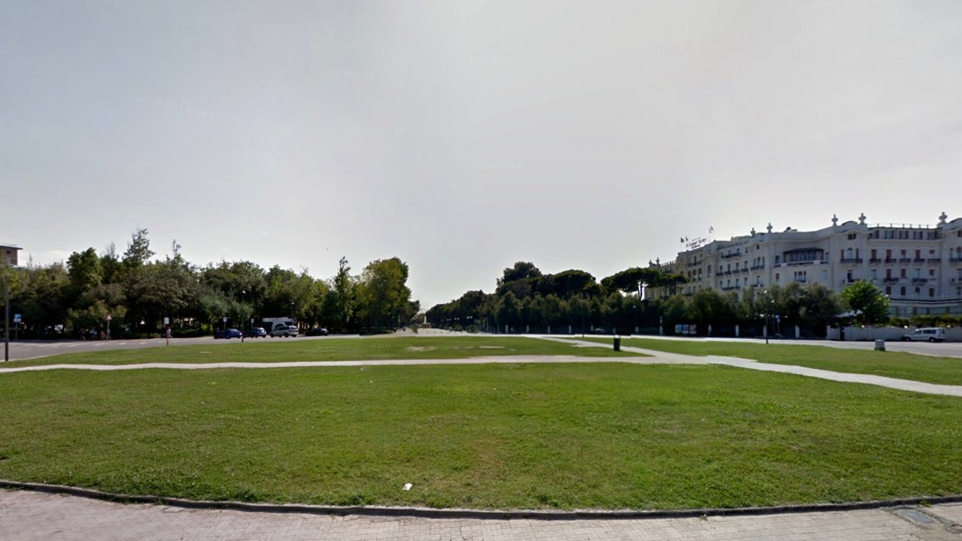 Foto 33/50 - Percorrendo il viale Tintori incontriamo il Parco Federico Fellini. Sullo sfondo una fontana. A destra il Grand Hotel di Rimini.