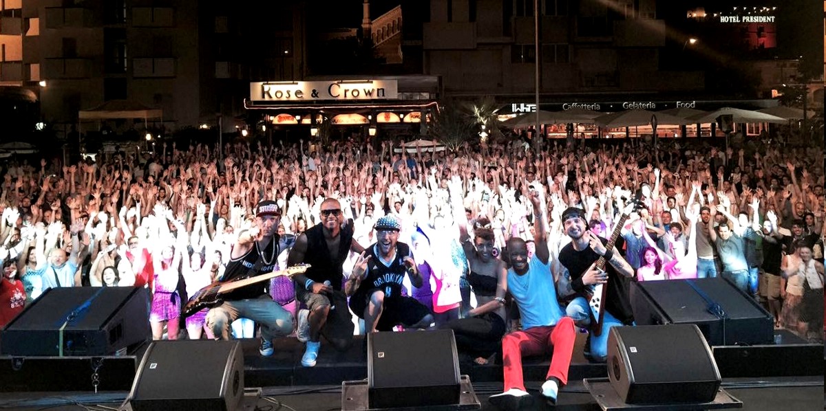 La foto, presa dalla pagina FB della band, rende l'idea di quanta gente ci fosse quella sera a Rimini. Sullo sfondo l'insegna del "Rose & Crown", organizzatore del Rimini Summer Festival.