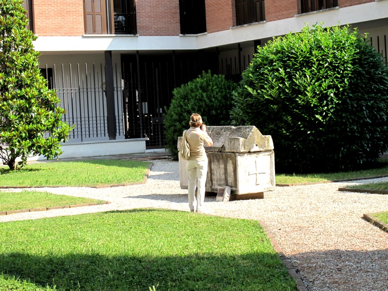 Foto 4/25 - Tempio Malatestiano. Esterno. Fausta sta fotografando un sarcofago.