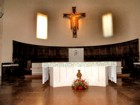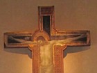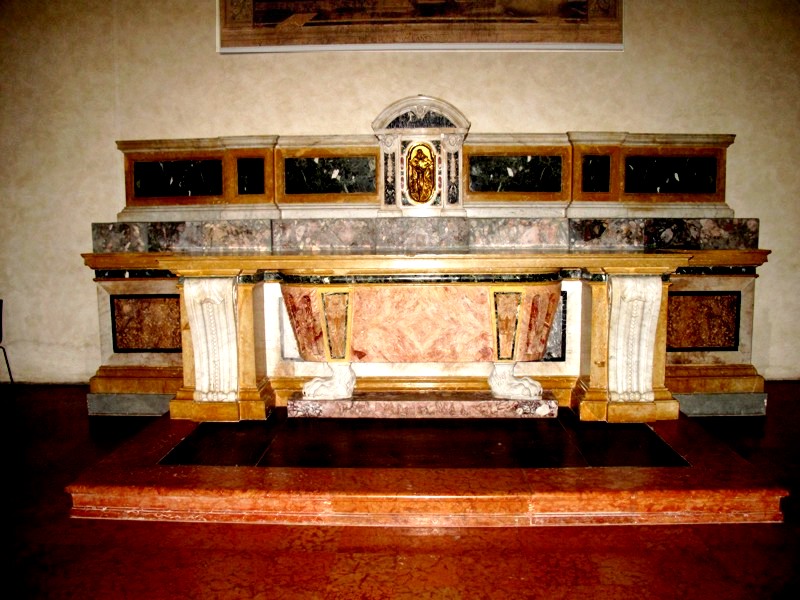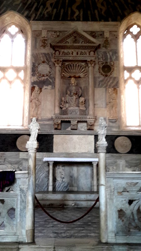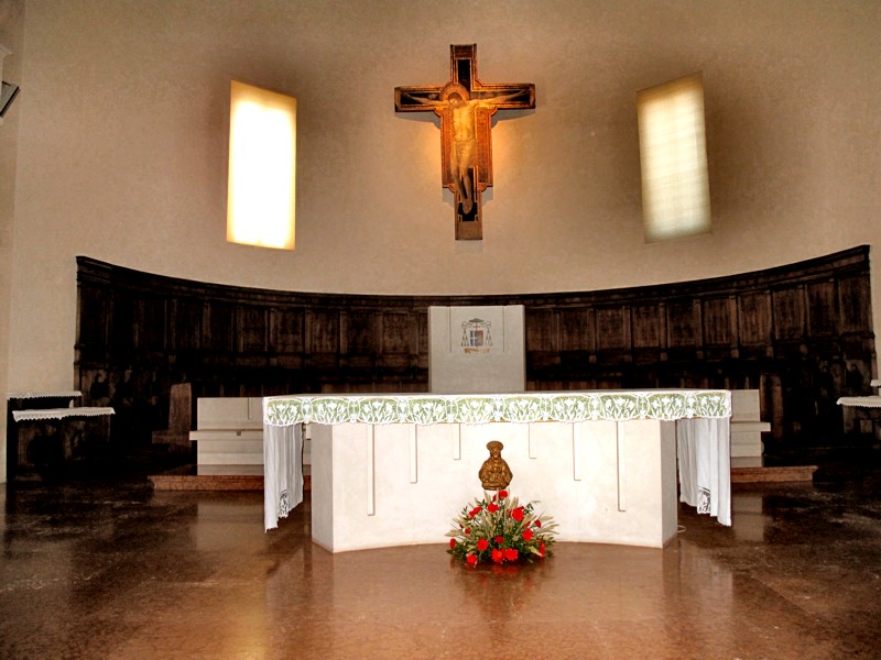 Foto 11/25 - Tempio Malatestiano. Interno. L'altare maggiore. Sulla parete il "Crocifisso di Rimini" opera di Giotto, datata 1300/01.
