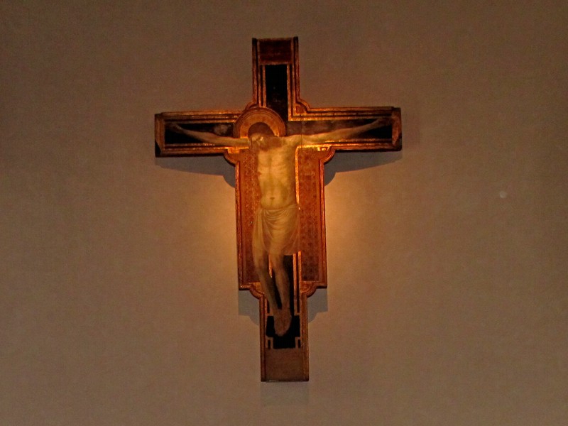 Foto 12/25 - Tempio Malatestiano. Interno. Crocifisso di Rimini. "Cristo è raffigurato sulla croce sagomata abbandonato al peso del corpo, con il capo reclinato, gli occhi chiusi, l'espressione affaticata e sofferente