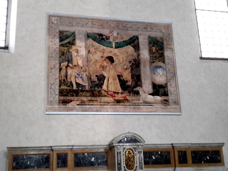 Foto 13/25 - Tempio Malatestiano. Interno. Sigismondo Pandolfo Malatesta in preghiera davanti a San Sigismondo. Affresco di Piero della Francesca, datato 1451.