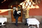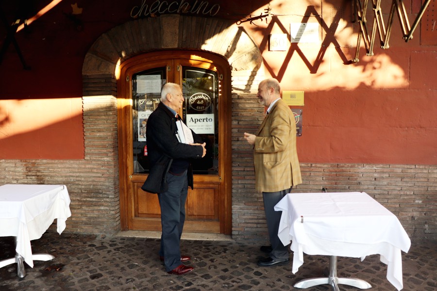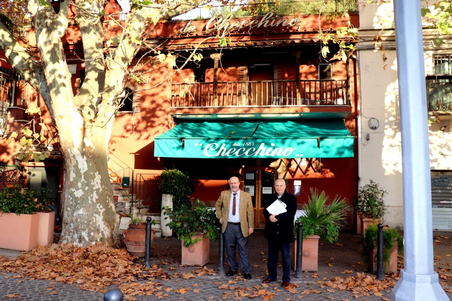 Foto 38/45 - Elio e Francesco all'esterno del ristorante. Francesco ci mostra le targhe sul muro.
