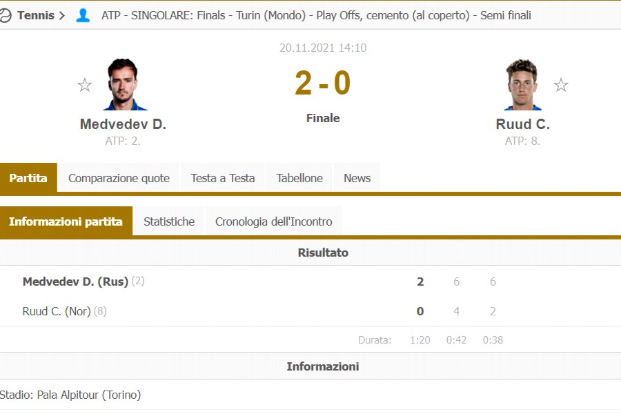 Daniil Medvedev è il primo finalista delle ATP Finals. Il russo rispetta il pronostico nella prima semifinale e sconfigge il norvegese Casper Ruud con un 6-4 6-2 piuttosto agevole. Il numero