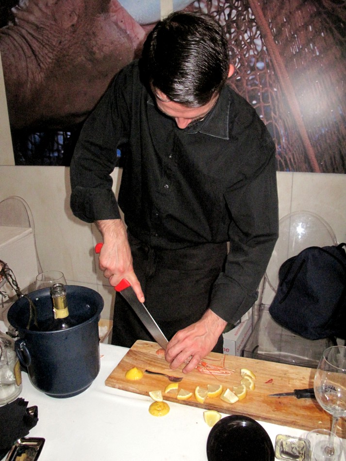 La delicata operazione del taglio del carapace della mazzancolla, degustata, subito dopo l'ostrica, con una coppa di Prosecco.