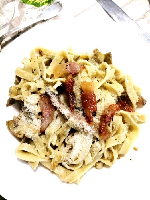 piatto che Fausta ed io avremmo potuto cucinare, le Fettuccine con i Carciofi alla Gricia, io ricordai di aver assaggiato con i carciofi i soliti rigatoni alla gricia, il noto piatto della gastronomia romanesca che, nel periodo dei